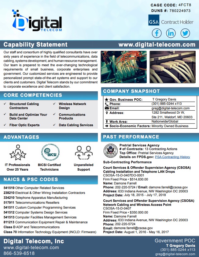 to meet the ever-changing technological requirements of small business, corporate enterprises and government. Our customized services are engineered to provide personalized prompt state-of-the-art systems and support to our clients and customers. Digital Telecom stands by our commitment to corporate excellence and client satisfaction.